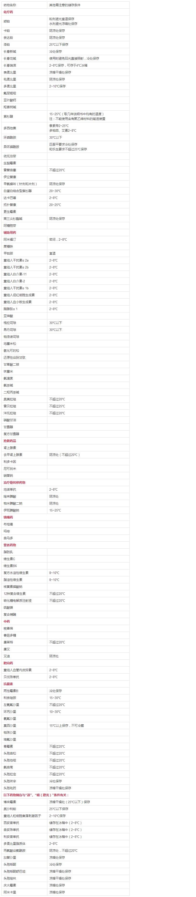 下表中列出的药物为肿瘤科常用的、在说明书中提出的需避光(或遮光)储存的化疗药、镇痛药、靶向药、抗菌素及辅助用药等。(储存条件在不同药品说明书中略有差异,但大体相同)