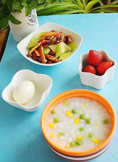 16、玉米青豆粥 胡萝卜莴笋炒笋 白煮蛋 草莓