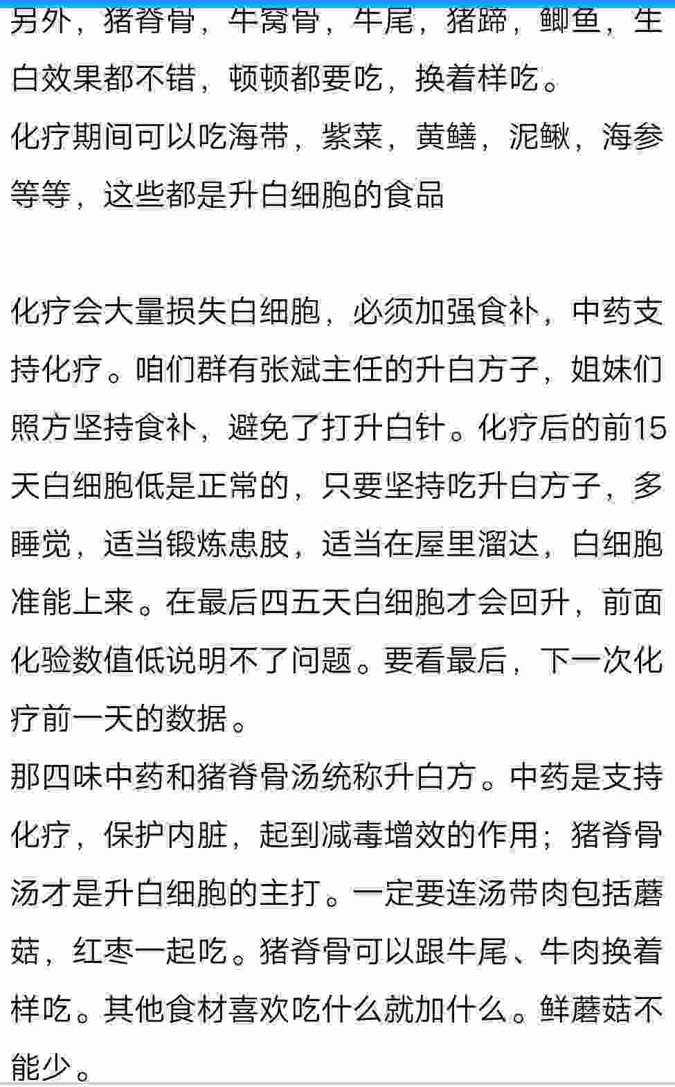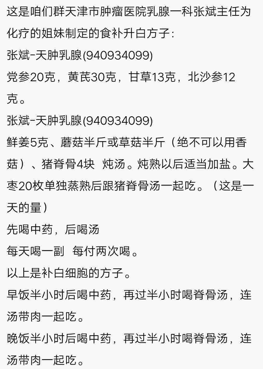 姐妹们,这是我在化疗期间学习天津肿瘤医院吃的升白方,小白一直都精神抖擞的,到周疗后白细胞没下过7呢。