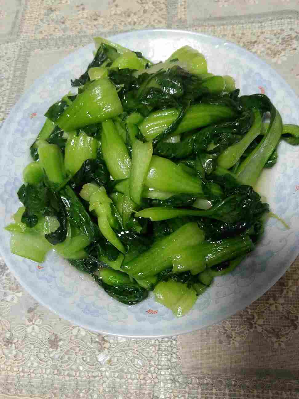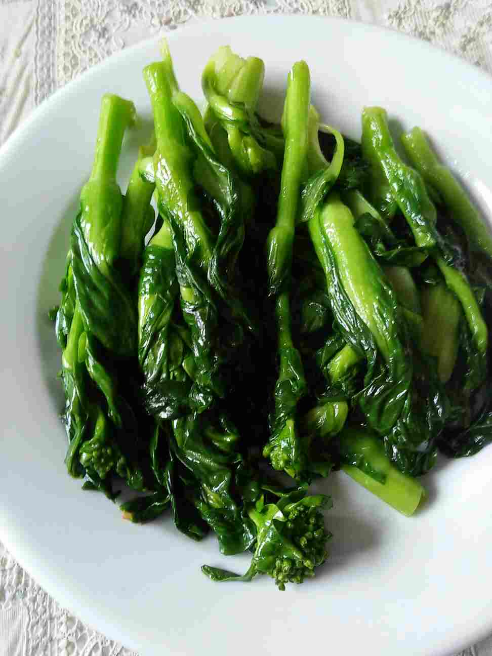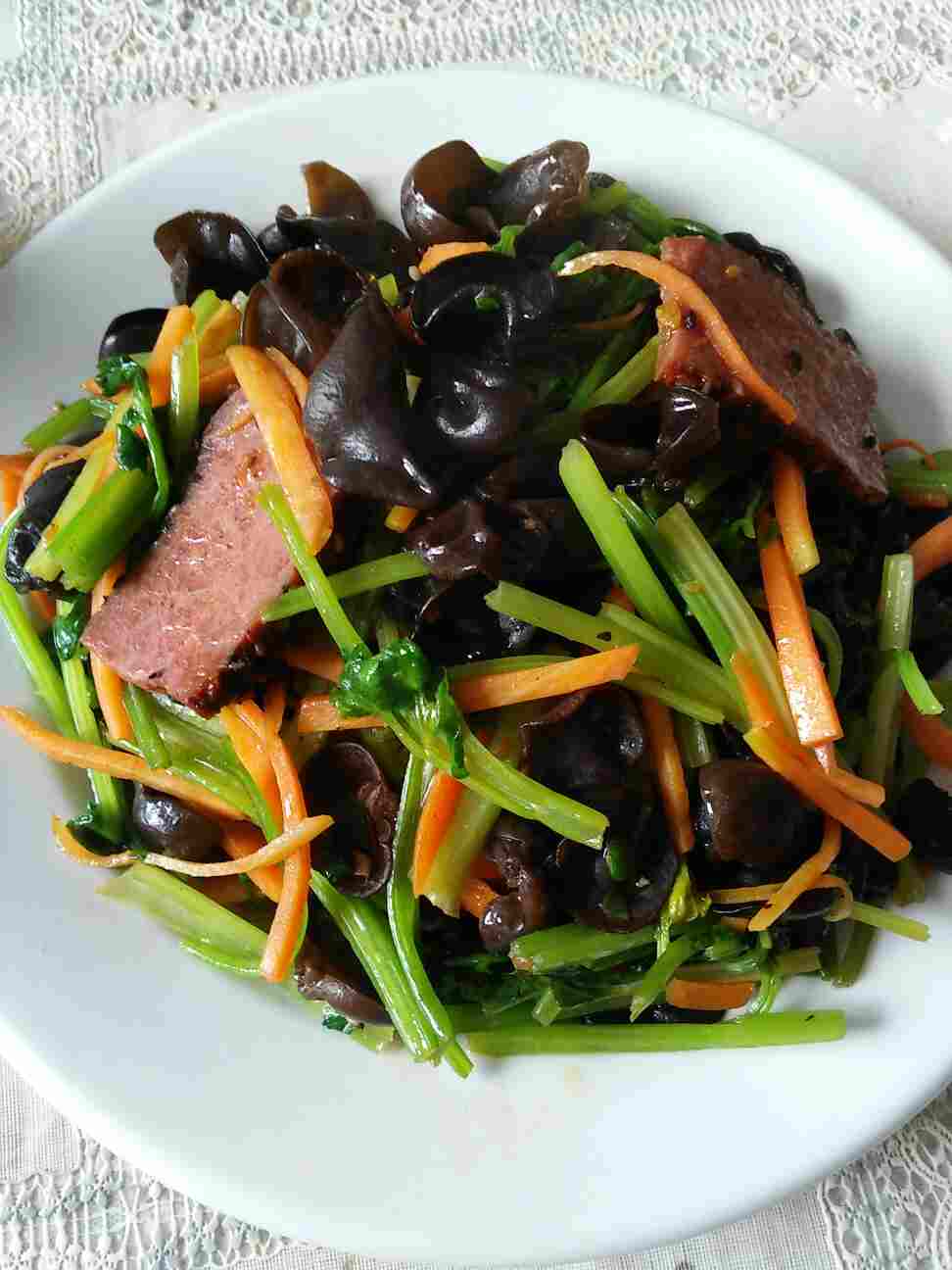 ,今天是一个素烧菜苔,一个素烧小油菜,一个杂炒,几块酱牛肉,一个玉米窝头