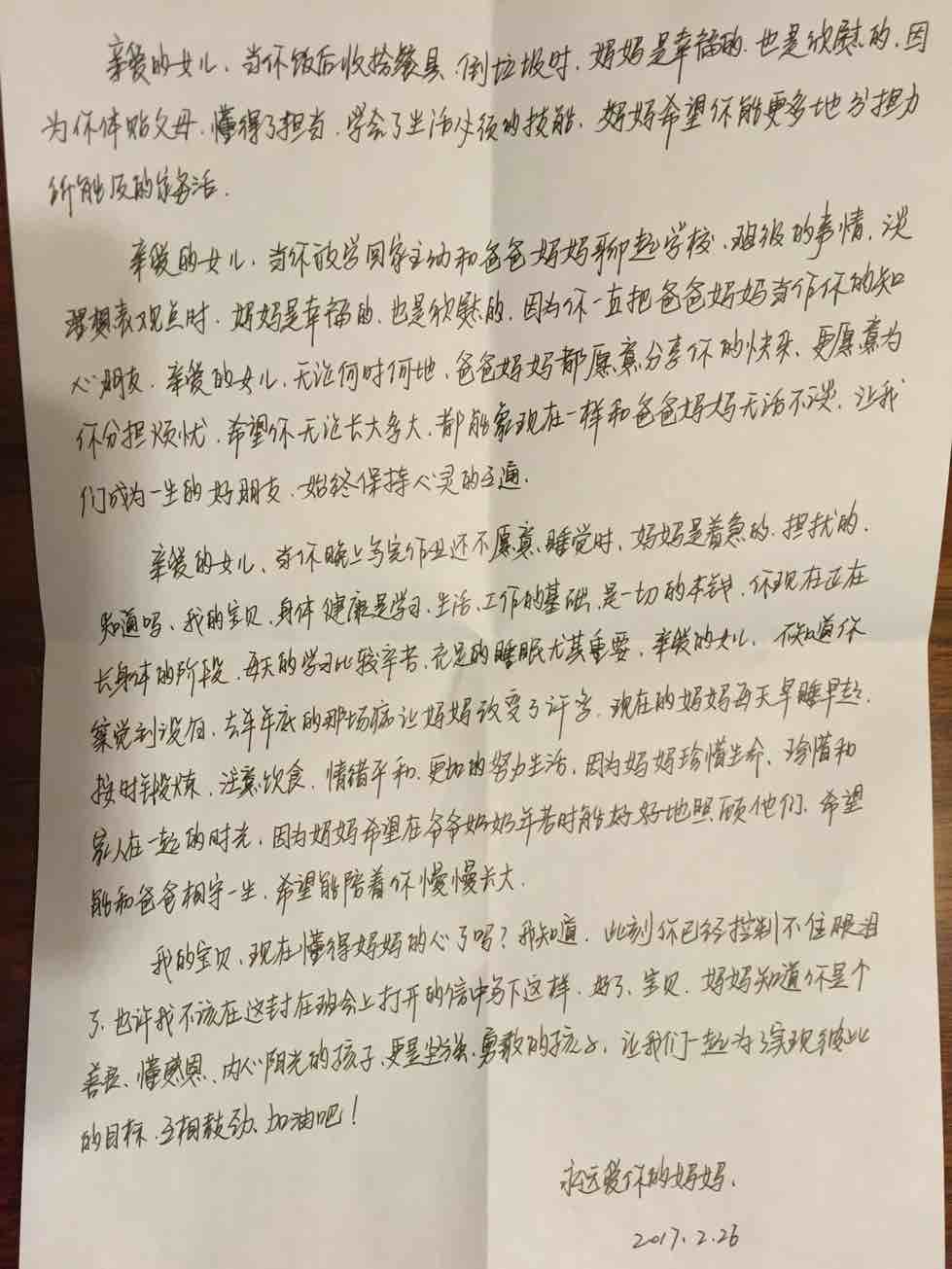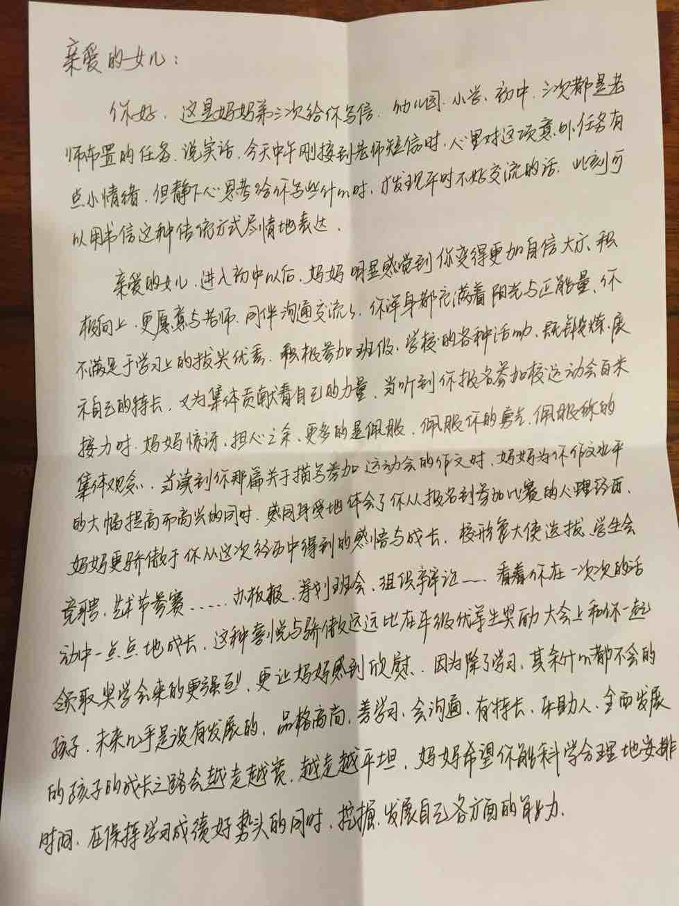 今天中午收到女儿班主任的短信,要求家长给孩子写封信,明天全校展示的班会上打开读信,先生比较“懒”让我写,睡醒午觉坐在书房给女儿写信,一气呵成。写完后,女儿问我:妈妈你写的啥,我看了会哭吗,全班就我一个哭怎么办?知女莫如母,知母也莫如女啊!生病后第一次在信中聊我生病的话题。