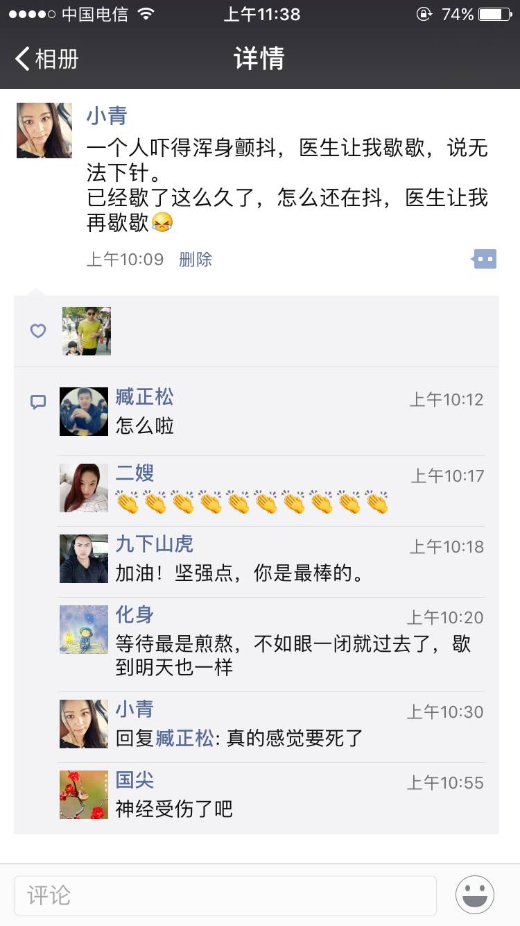 我们这个病 小刀针治疗你们觉得有可能会根治吗 我最近一直在治疗颈椎病 医生听说我有红斑狼疮 他说一起治疗 都是小刀针治疗的 很长的一根扁针 一直戳到底 每次六根针 今天八针 每一针戳下去 我都不想喘气 医生就特别怕 可是真的很痛 这个就等于微创手术 真的有点吃不消了 这个疗程还有两次 一个疗程七次 我知道不知道该怎么办了 狼友们 给点建议吧 继续坚持治疗 还是放弃呢……