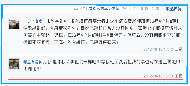 “鱼”的遗愿 “鱼”是一个有着十年肺结核病史的女孩。我们联系到她的时候已经广泛耐药,伴发严重心衰,身体浮肿,在租的一间小屋里靠呼吸氧气维持身体,情况十分严重,生命危在旦夕。 她知道自己的病情已经非常严重,很难再继续治疗。当我们提出要帮助她的时候,“鱼”果断拒绝了帮助,要把机会给其他需要的病友,听着电话声中虚弱的声音,采访人员也哽咽了。面对这样的情况,贴吧吧友们集体发短信鼓励鱼,吧内开专贴刷楼送祝福,卢水华主任亲自电话询问“鱼”的病情,人心牵挂!温馨感动的力量说服了“鱼”,她答应配合救助小组工作,答应大家坚强走下去! 大家在关注,卢医生在关心,我们救助小组也在全力以赴展开救助计划。就在我们解决好一切救助问题的时候,“鱼”突然去世,那一刻得到消息的人全体无言,我们沉默了......病魔面前的无能为力和难过。 2013年1月13号:上午开始办理救助捐款通道;下午三点,捐款账户成立;晚上,得知鱼已去世。——“我不需要大家的捐助,请留给其他需要的人,让更多的人得到帮助吧!”鱼去世后,大家大受打击,很多人悲痛中燃起了热血的刷楼宣誓:保证好好吃药,坚持治疗!在这些刷屏的口号之下,更是对“鱼”的痛惋! “鱼”最初来到贴吧的时候看过我写的一个复发案例的科普贴,她回帖说:“等我死了以后把我的事也写在上面吧,谢谢。”,当时我真的只是随便一看,因为觉得死亡离我们还很远,也没有一个人会想到死。可是始料未及的结果还是出现了,“鱼”说的那句“等她死后把她的故事写出来”的话几次浮现在脑海,昨晚躺着又想起了“鱼”生前的事,然后爬起来又去“鱼”的网上灵堂看了下,觉得似乎有某种东西牵引着我,或许应该完成“鱼”的遗愿了!