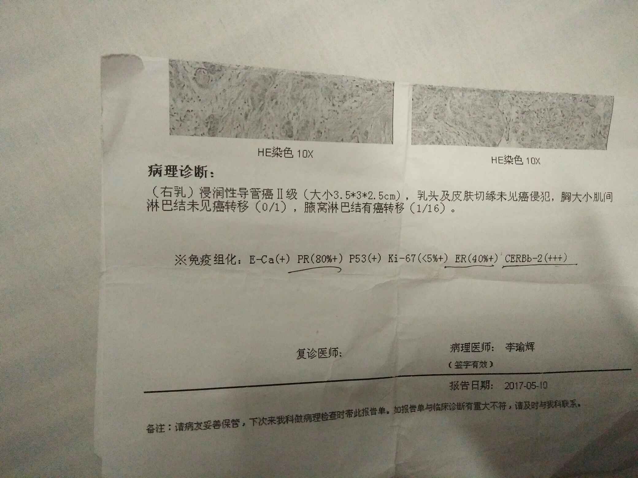 三阳,ki-67很低!有一个淋巴转移!我当时是前哨有一个转移,我的主治医生推荐我放疗了!说年轻放一个会放心一些!