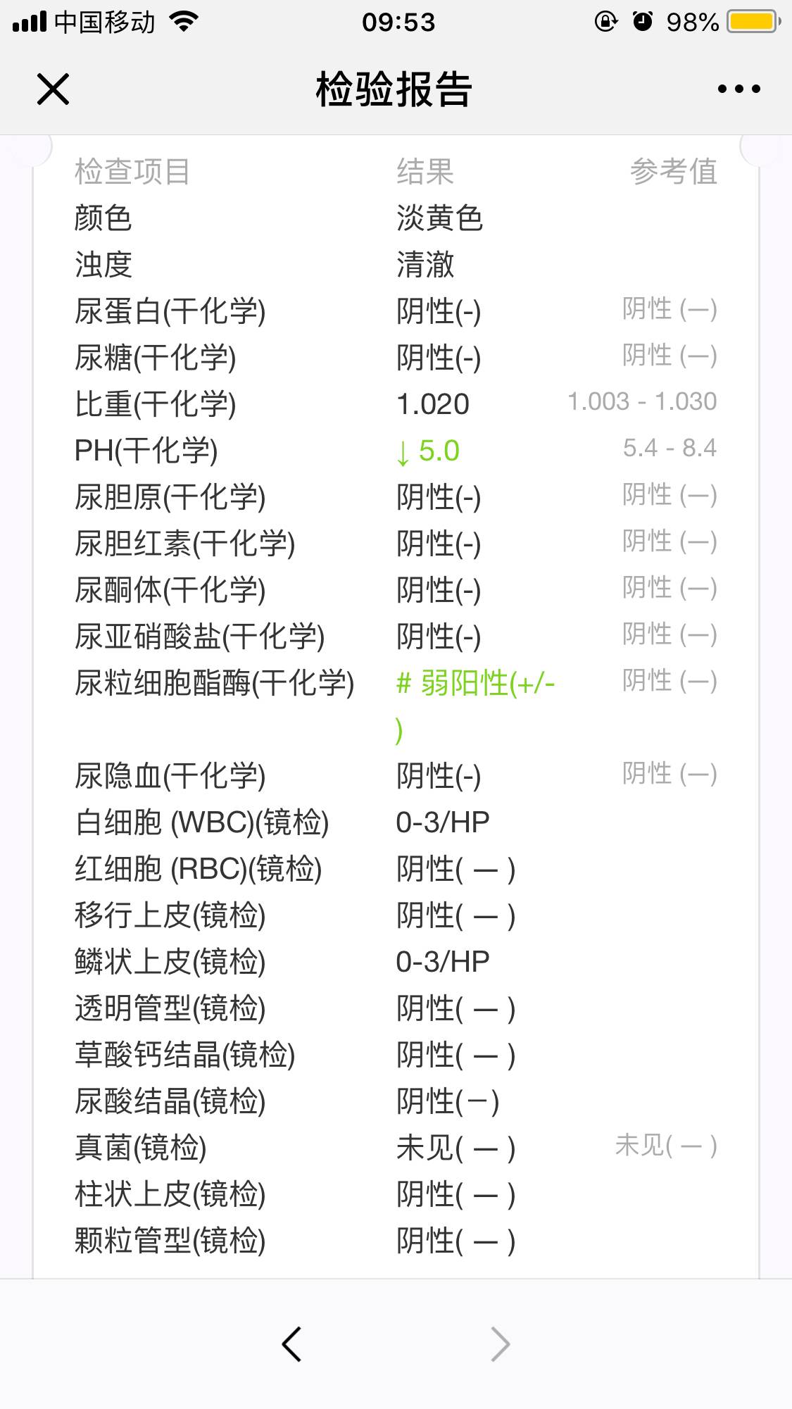 刚刚验的尿立刻就有结果了,但有两项不正常,ph值低和