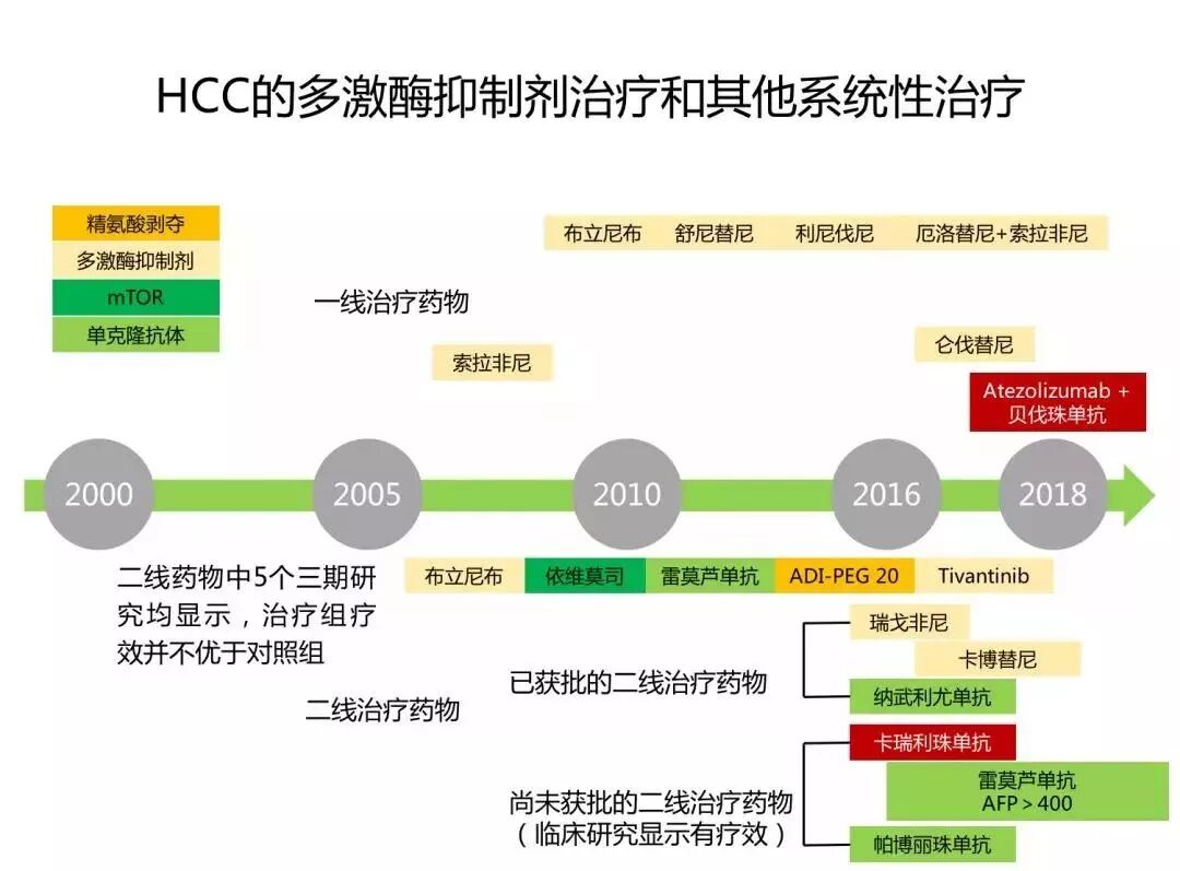 Atezolizumab 贝伐珠单抗作为有效方案目前尚在临床2期研究中。二线治疗方案较多但不少药物的3期研究显示无效。获批的二线治疗药主要有瑞戈非尼或纳武利尤单抗。