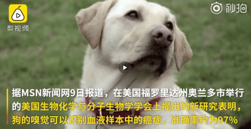 据外媒9日报道,在美国福罗里达州奥兰多市举行的美国生物化学与分子生物学学会上提出的新研究表明,狗的嗅觉可以识别血液样本中的癌症,准确率约为97%。未来狗狗可能成为人类筛查癌症的重要小帮手。