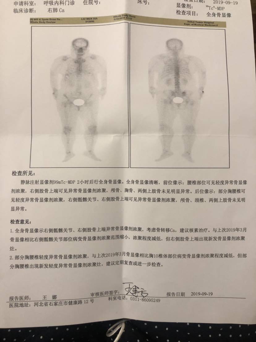 麻烦问一下大家 我妈妈今年三月开始吃9291 输骨转针 现在对比上次胸部CT肿瘤大小无变化 昨天去做了骨扫描 原来的两块骨转移灶减小了也轻了 但是又新增两块骨转 请问是耐药了吗 需要连药么还是继续原方案