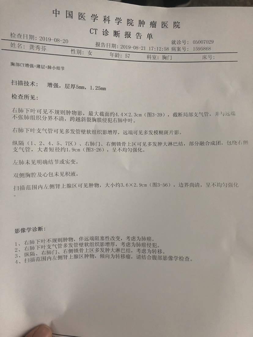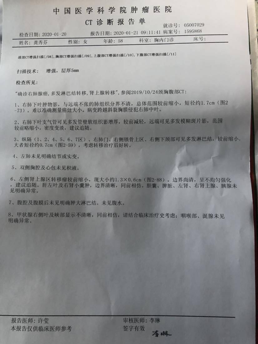 妈妈患肺癌已经有三年了,这三年来一直在接受治疗到现在,下面是妈妈检查以及治疗的过程。2010年10月,妈妈体检出肺癌IV期,纵隔淋巴转移,肝部转移,去省肿瘤医院复查,做了PET-CT,结果一样,省肿瘤