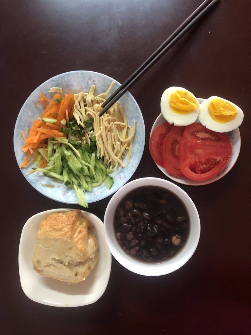 由于中午我觉的品种多,实在吃不了,吃不下那么多也是浪费,所以我变成早晨增加几样蔬菜,这样中午就可以变得少点。