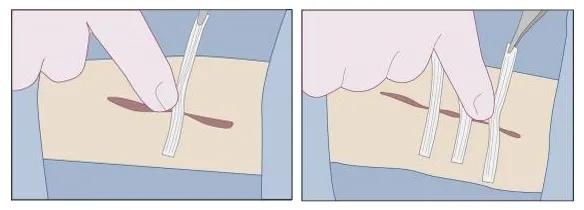 首先,给伤口止血、清洁后擦干,保持伤口两侧边缘的干燥,然后再用手指轻轻挤压捏合伤口两侧,使边缘对齐并尽量靠拢,把免缝贴垂直贴在伤口一侧,然后轻轻牵拉皮缘保持对合,再把免缝贴的另一半贴在伤口对侧。