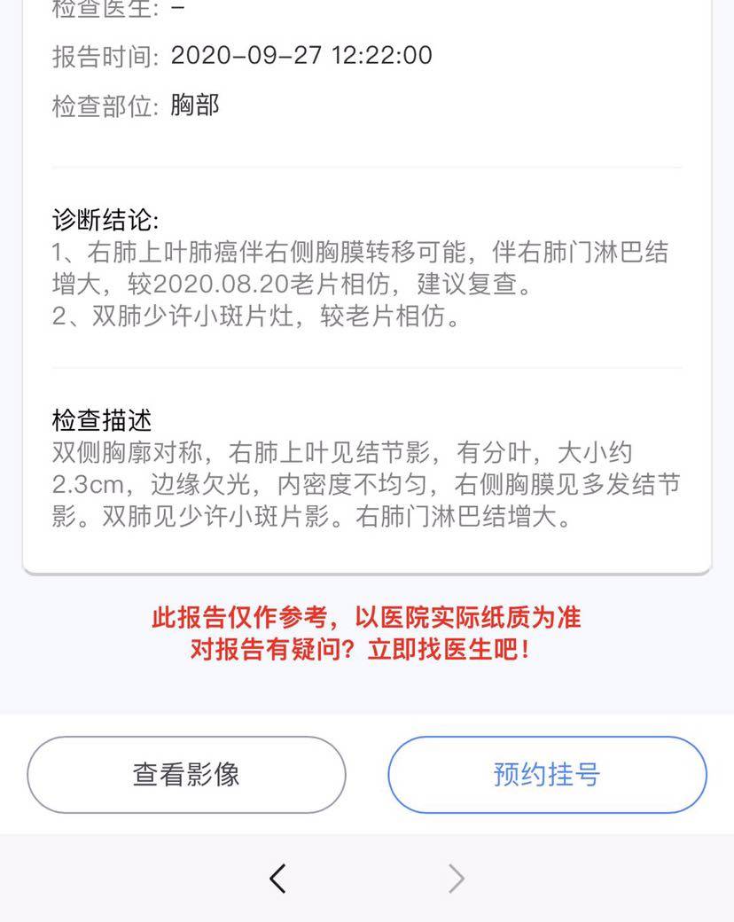老妈8月20号ct报告显示病情进展,肿瘤由1.4增长到2.3,然后做了基因检测,只检测到NTRK3突变,主治医生让继续服用凯美纳,并增加了一种靶向药克唑替尼,9月6日开始服用,当天测了一下cea,是12.04,9月21又测了一次cea,是12.26,增长速度降下来了,但还是略微增长,因考虑到国庆节节假日时间,所以选择提前做了ct,9月24日做了ct,报告显示与上次相仿,肿瘤没增加也没减少,应该是暂时控制住了吧,但相比第一次吃靶向药,第一个月缩小一半的结果来看,这个结果还是让我不安,总感觉会不会很快就耐药了。还没见医生,到时候听听主治医生的意见吧,今天拿到这个结果发给大家看看,也是给大家提供一个治疗思路吧,之前看过很多帖子,没看到过这两种联合的方案