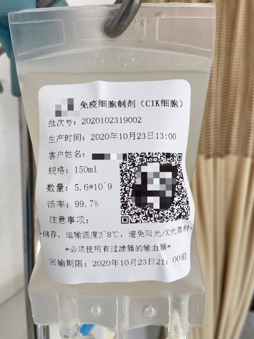 回输完之后就结束了,像挂了一袋盐水一样。该回家回家,该干嘛干嘛了。只是特别叮嘱,今天明天注意休息,可能会有点困,累。因为体内细胞要开始战斗了!