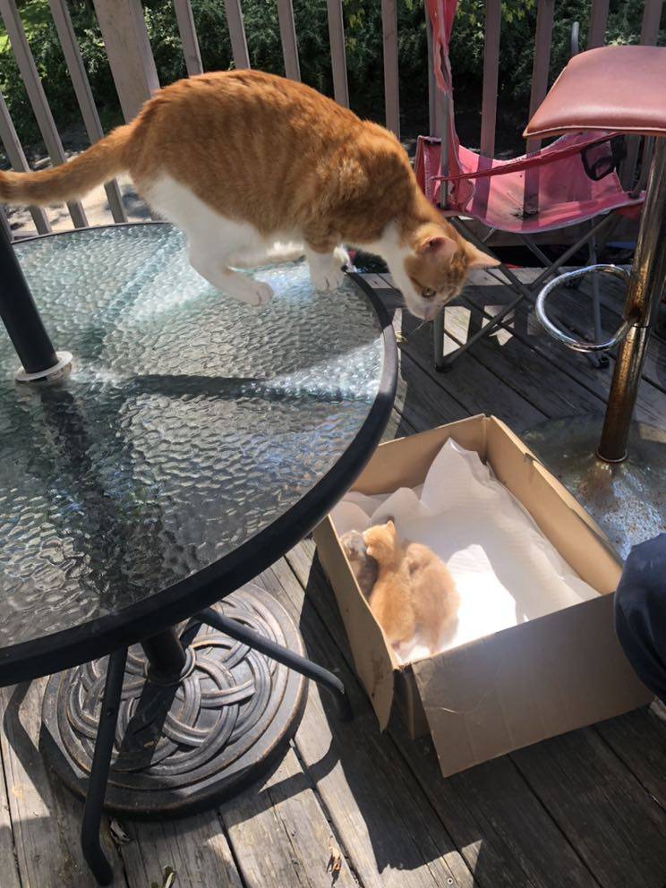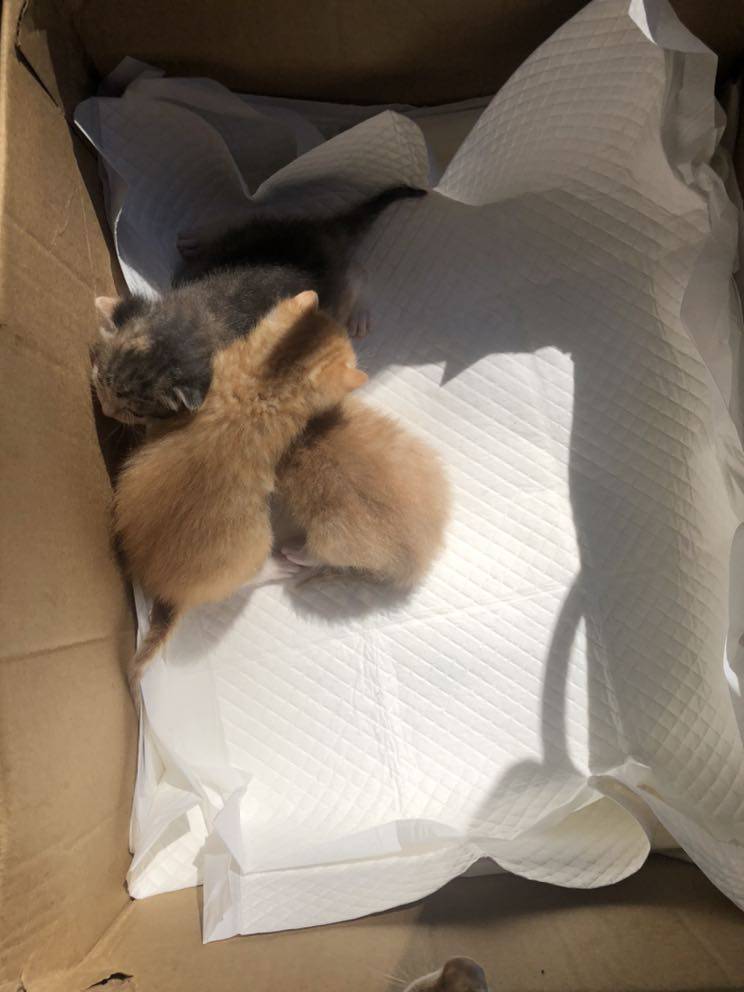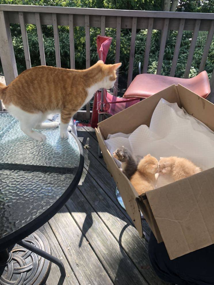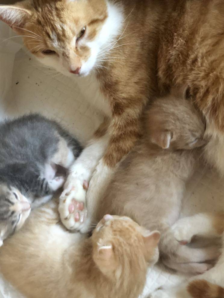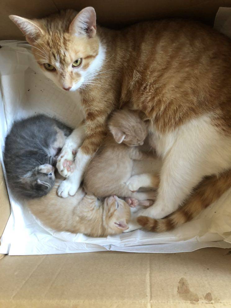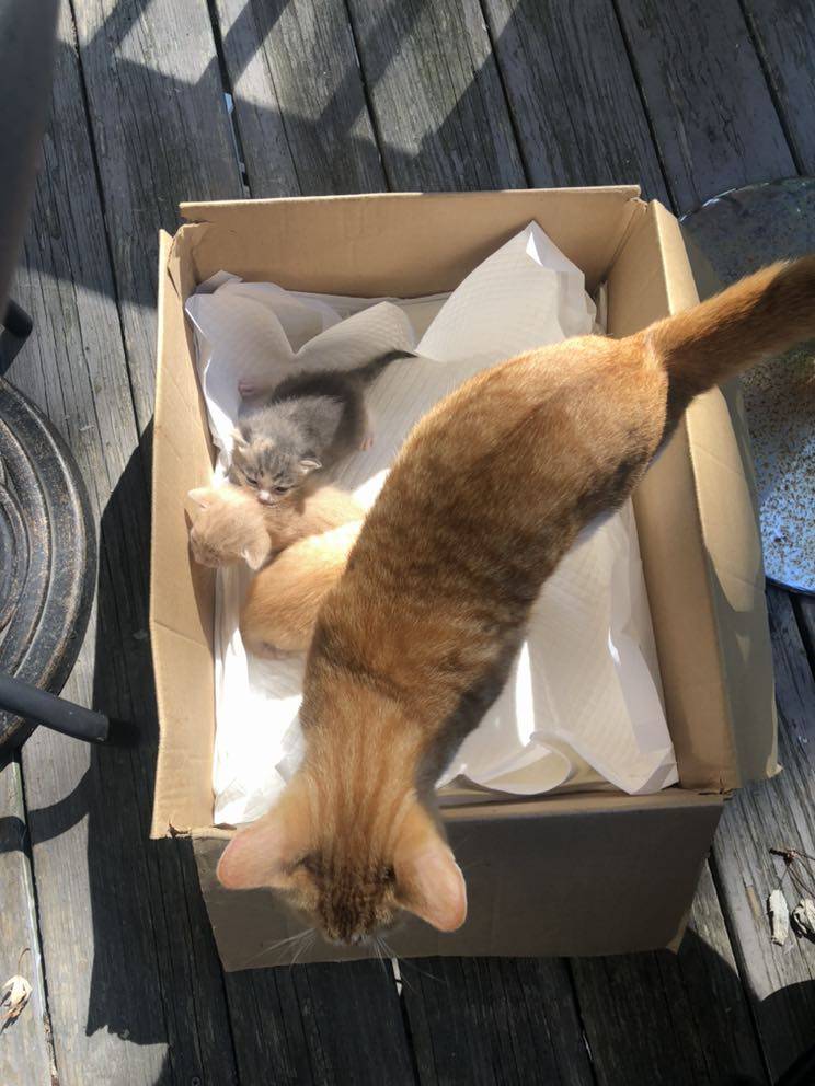 妈妈过来跳进我膝盖上的盒子。我就这样抱着四只猫咪