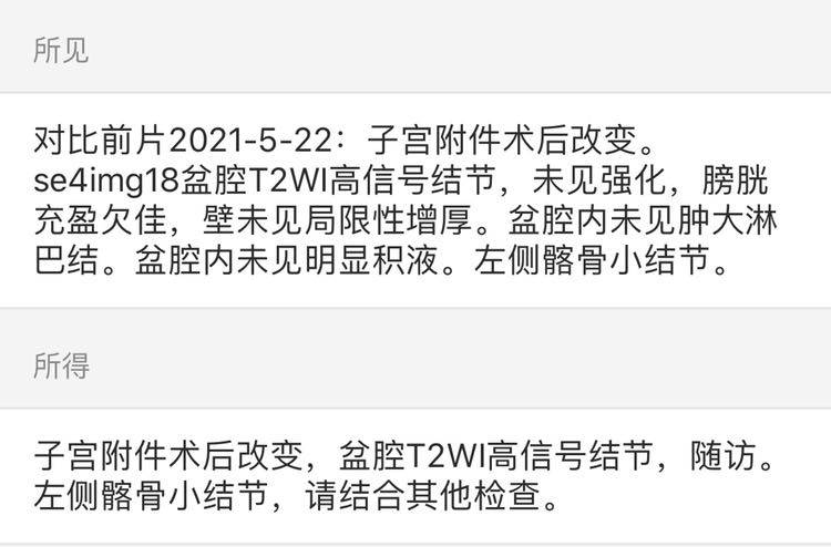 作为子宫双附件手术后的第一次盆腔磁共振复查结果不是很好,提示盆腔高信号结节,左侧髂骨小结节。忐忑