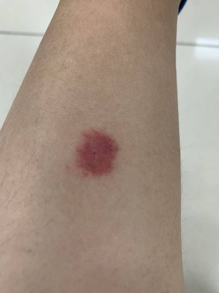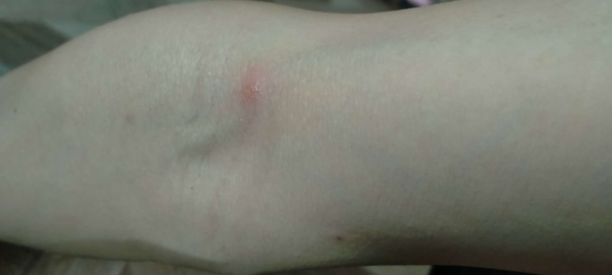 我右手臂弯处血管上皮肤有一颗红色的疹子好几天了没你大颗,不敢抓破。你看看