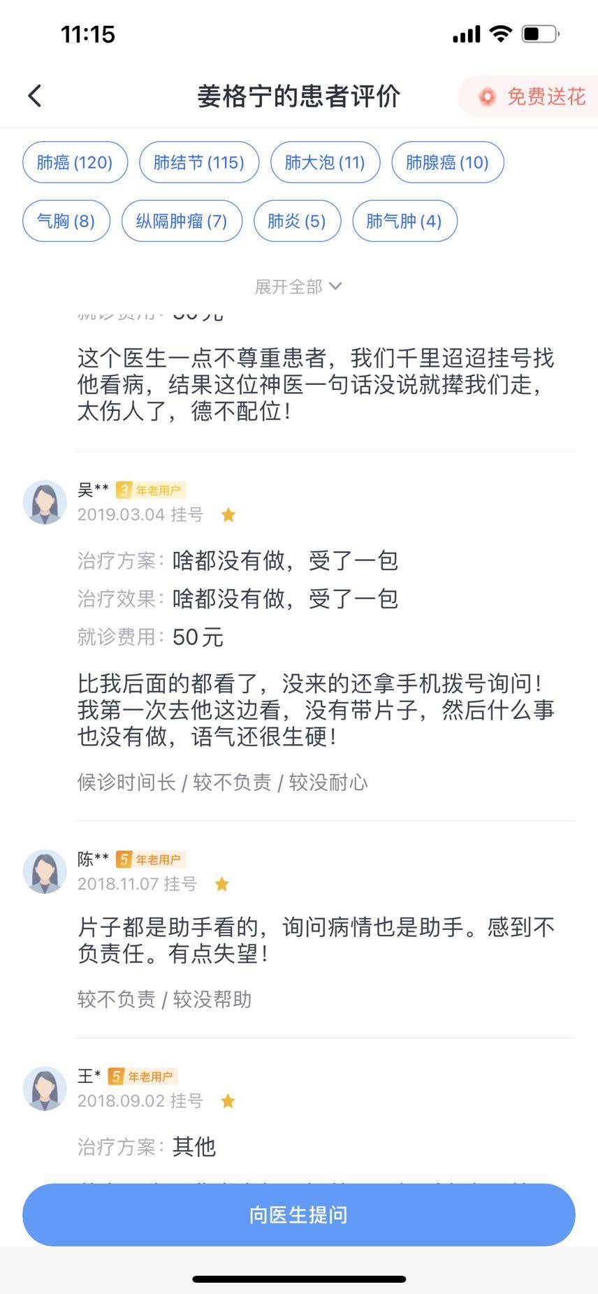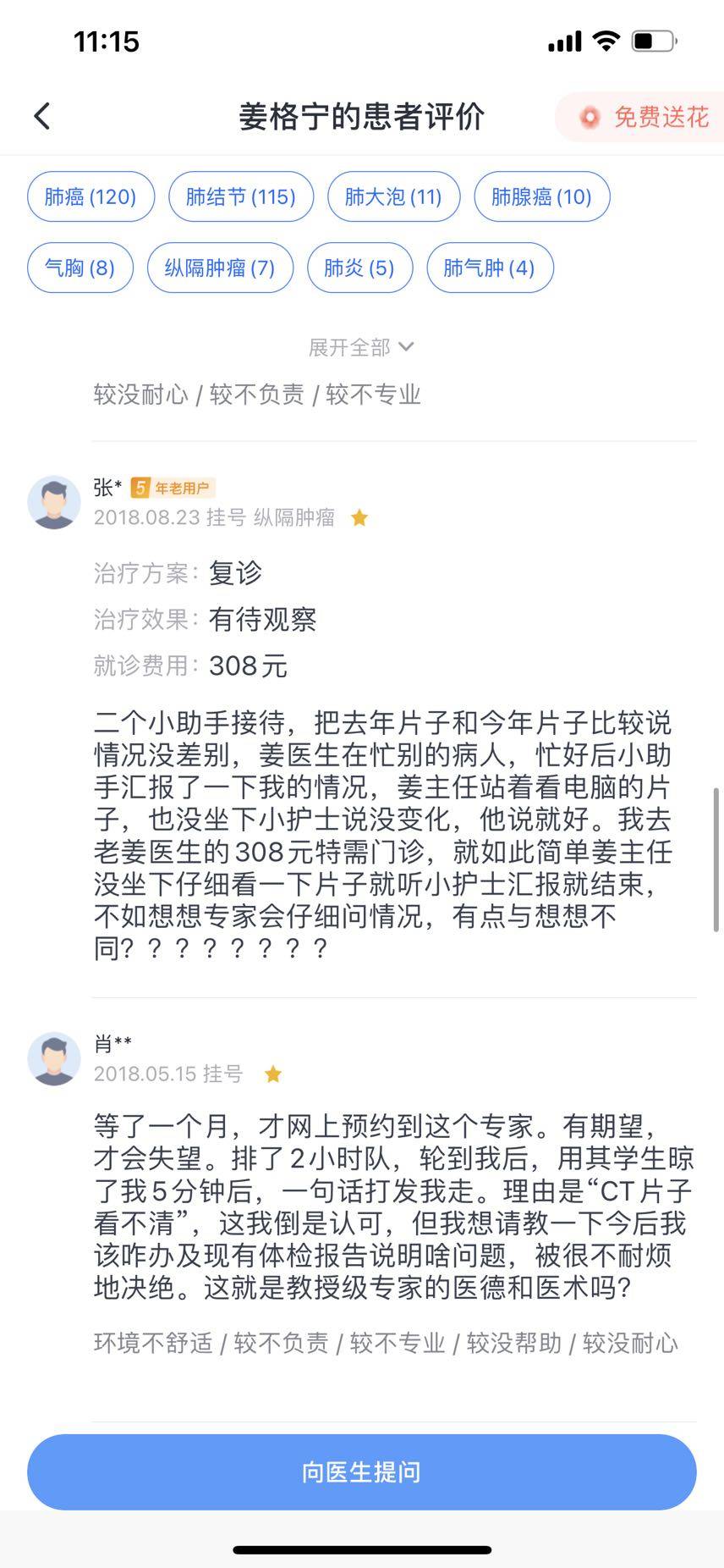 花了千辛万苦挂了这个所谓大咖,黄牛价炒到1200。没想到该医生是殿堂式问诊,同时好几个人一起看,当然不是自己看,都是学生,偶尔下来巡视一下,抬抬眼皮,看到中晚期患者就说去内科,不归他管,问他情况,态度十分恶劣,肺结节早期患者他才坐下来详细说。在此之前我也咨询过几个医生了,都让降期手术,并且认真看片,他是连片子都不碰。看了一下他的评价,群众的眼睛是雪亮的。建议大家不要迷信大咖,有些人真的是沽名钓誉,为了所谓治愈率良心都没了。