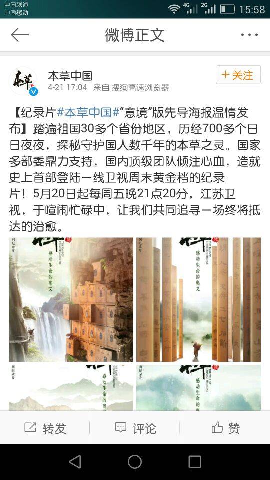 回到标题吧,现在我们有这样一个机会可以好好认识我们的中医药文化,那就是江苏卫视即将有一个大型中医药文化的系列纪录片播出叫《本草中国》,具体内容在下图中,请查看下图吧。