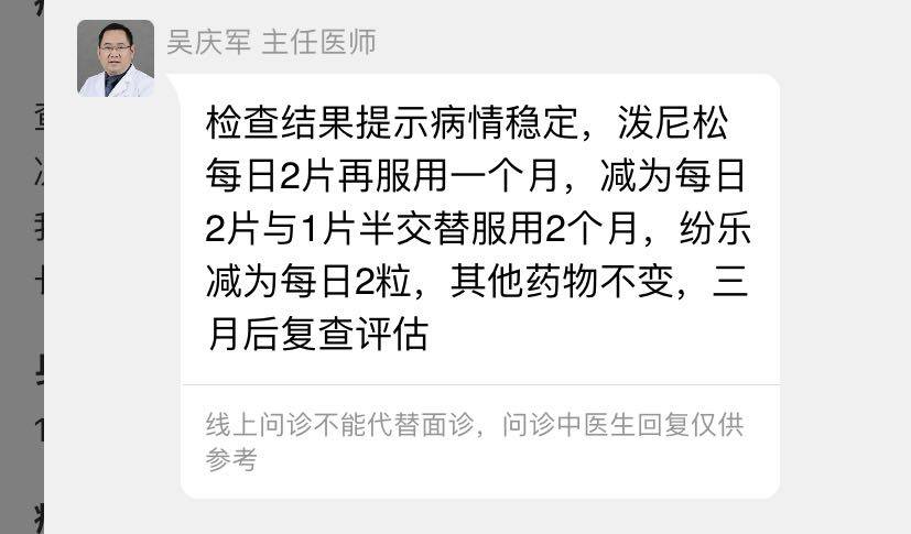 我可能跟其他患者不一样,别人想减激素,担心激素的副作用,而我一心想减吗替和纷乐…. 所以吴教授的意见 我仅供参考并没有执行。