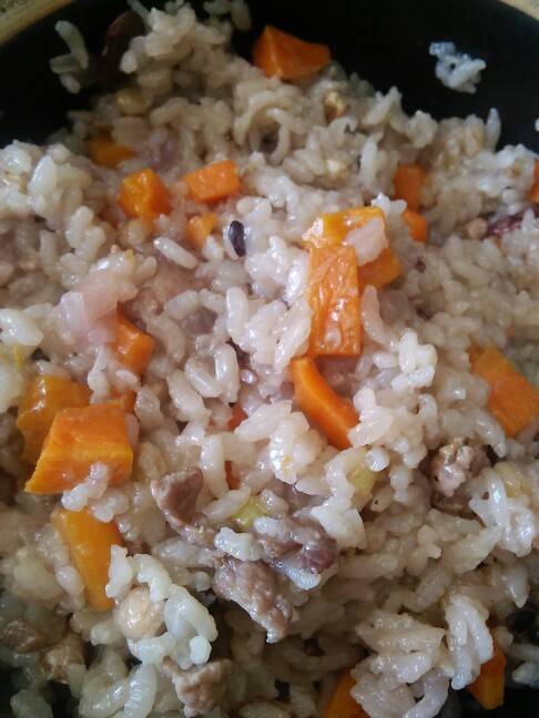 鸭肉。杂粮米。胡萝卜。洋葱。均少许...结果,洋洋洒洒满满一锅
