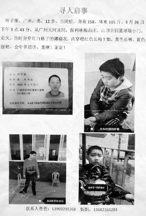 【新闻消息】玩耍时与父亲走失,12岁的自闭症男童叶子荣在龙洞林海山庄失联5天。3月31日,广州天河警方通报称,叶子荣遗体在龙洞街天源路某水库附近被群众发现,经初步勘验符合高坠身亡特征。