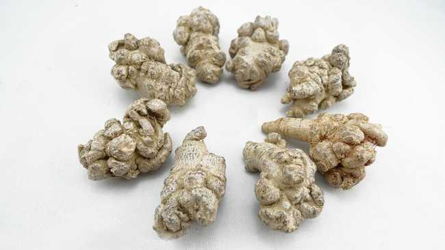 三七为五茄科植物人参三七的根。夏末秋初开花前、或冬季种子成熟后采收。选生3~7年以上者,挖取根部,剪除细根及茎基,晒至半干,反复搓揉,然后晒干。再置容器内,加入蜡块,反复振荡,使表面光亮呈棕黑色。