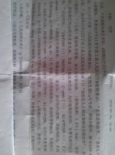 我今年实际年龄29周岁,去年我在省城医院做的化疗,四个疗程,之后每天吃他莫西,每隔28天打一次割舍瑞林至今。这是第二次复查,省城医院大夫说为了不让我来回跑,在当地三级以上医院复查就可以,下一次再去省城医院。在办住院的时候,大夫特别疑惑的告诉我,是哪个医生给我开的药?出的方案?我就问他有什么不妥吗?那医生说这是对患者的不负责任,这样用药不成立,这两个药是相抵触的……说了很多让我听着不舒服的话……