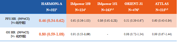 与既往“四药联合”方案研究相比,HARMONi-A中依沃西单抗联合化疗PFS和OS的HR值均最低。HR值越低,意味着延长生存期的获益越大,这也进一步肯定了依沃西单抗能够为肺癌患者带来生存期延长的“惊喜”。