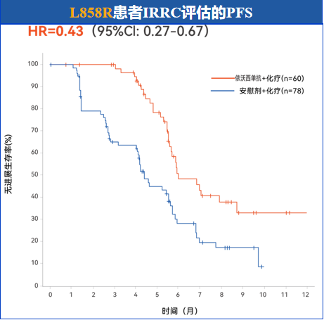 对于EGFR L858R突变患者,使用依沃西单抗联合化疗可降低疾病进展或死亡风险降低57%;