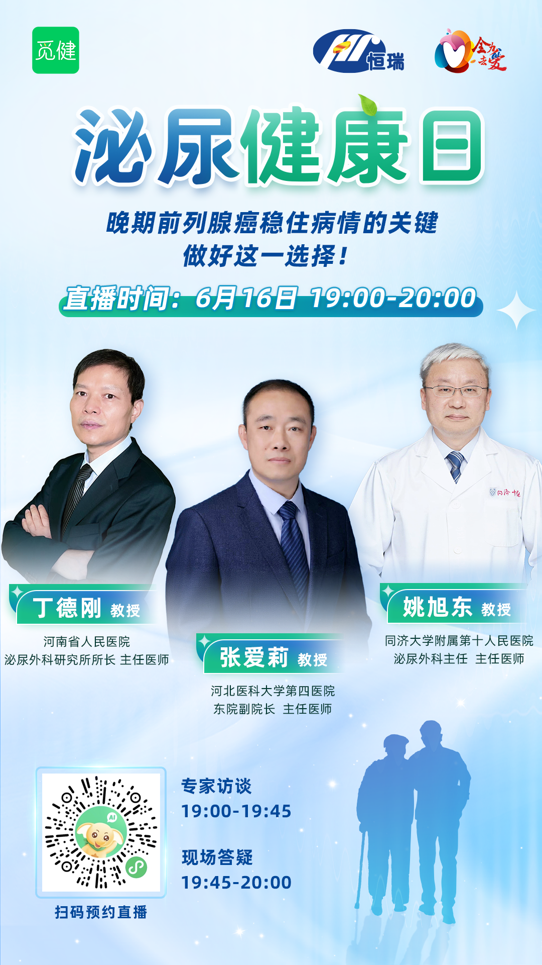 觅健特别邀请到 河北医科大学第四医院泌尿外科主任医师 张爱莉教授、河南省人民医院泌尿外科主任医师 丁德刚教授 和 同济大学附属第十人民医院泌尿外科主任医师 姚旭东教授 2025年6月16日(周一)19:00-20:00,为觅友们开展主题为晚期前列腺癌稳住病情的关键,做好这一选择!的线上直播。