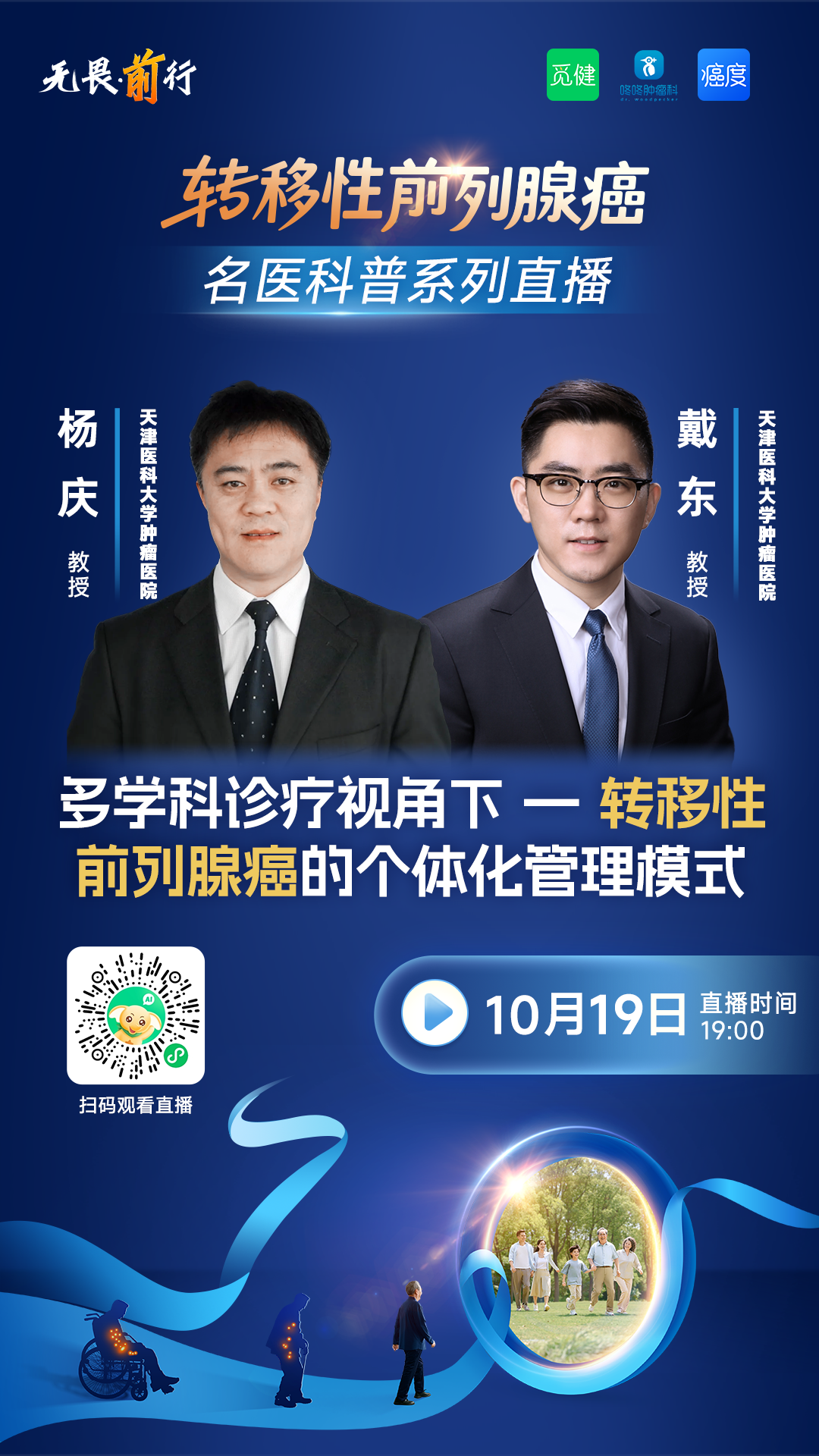 对此,觅健特别邀请 天津医科大学肿瘤医院泌尿外科主任 杨庆教授 与 天津市肿瘤医院空港医院核医学科主任 戴东教授,在10月19日(周日)19:00亲临“无畏前行——转移性前列腺癌名医系列科普直播”的现场,为您解惑!