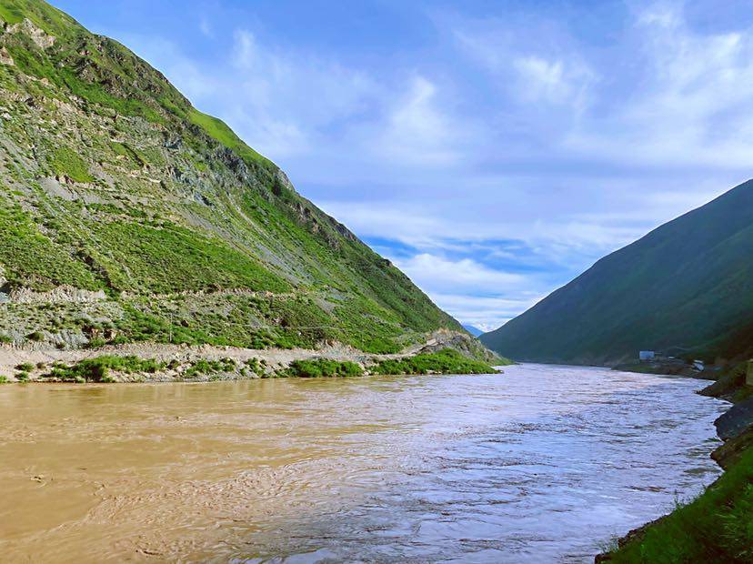 出巴塘,金沙江一路跟随,不舍不弃,河道宽阔平缓,江水沉渣泛起……金沙江生就一支妙笔,自成一体,在江面挥洒出一条条波浪线,一个个同心圆。左边高山峻挺,右边大江东去,行路艰难。