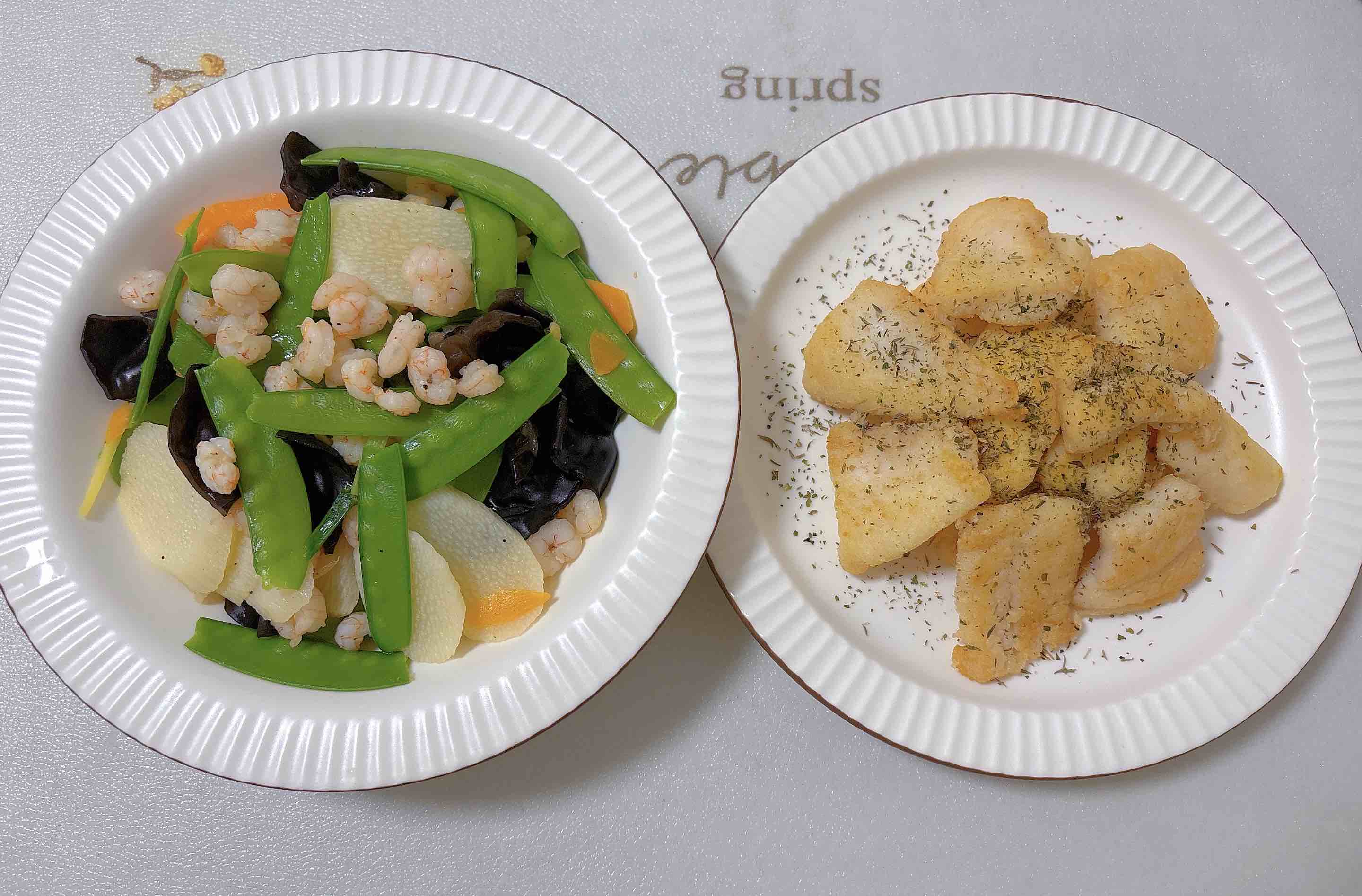 今日份健康餐上线~左边是虾仁炒时蔬,虾仁鲜嫩,蔬菜清爽;右边是香煎鱼块,外酥里嫩。