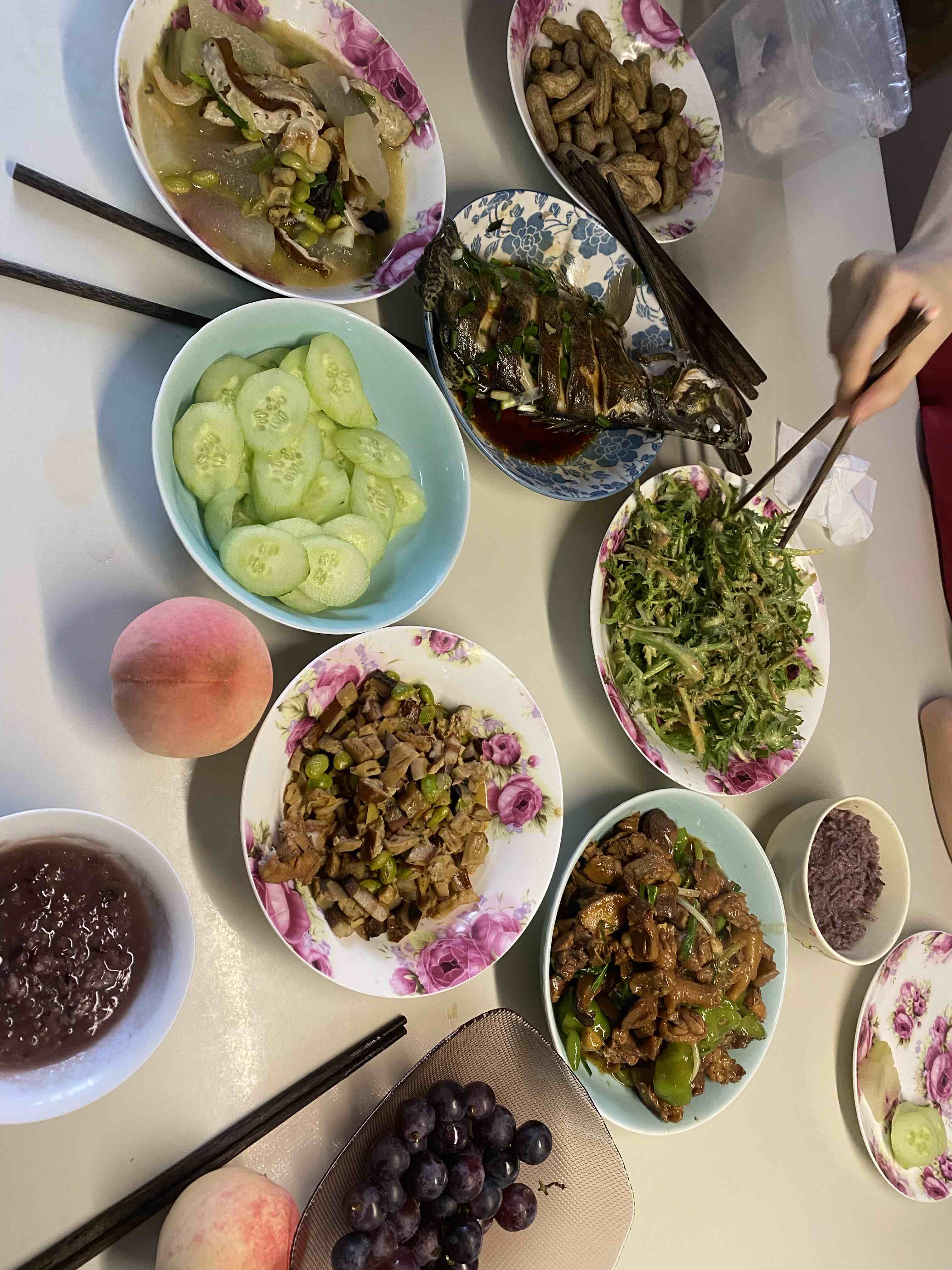 今天的晚餐品种有点多,有鸡、鱼、豆制品,还有三个蔬菜。