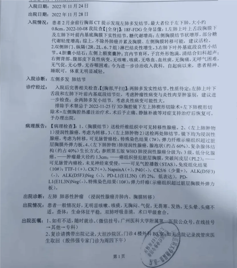 为了进一步确认病情,我去了广州一家专科医院。医生建议做PET-CT,结果提示多个结节代谢活跃,报告中写着“不排除肺癌并累及胸膜”。但由于我没有医学背景,并未意识到这意味着什么。那时正值疫情管控最严,就医和请假都很不方便,我想着“早点处理完,好恢复工作”,就决定接受手术。那时最担心的,是工作如何安排、请假如何协调,而不是这几个结节到底意味着什么。