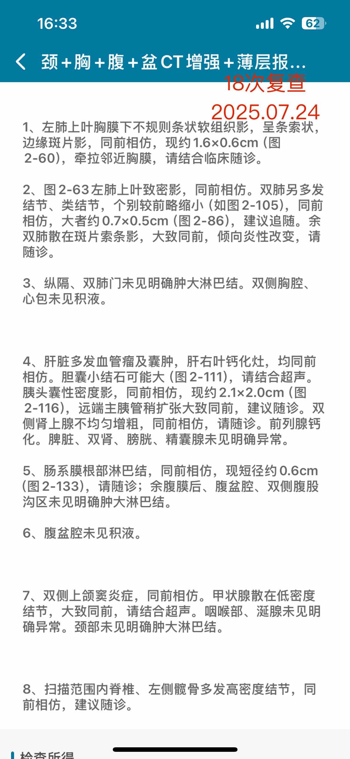 今天去查了ct,8点半做完,10点多就可以在114公众号查到报告了。一切同前,安心三个月,下次复查就是10月份了。