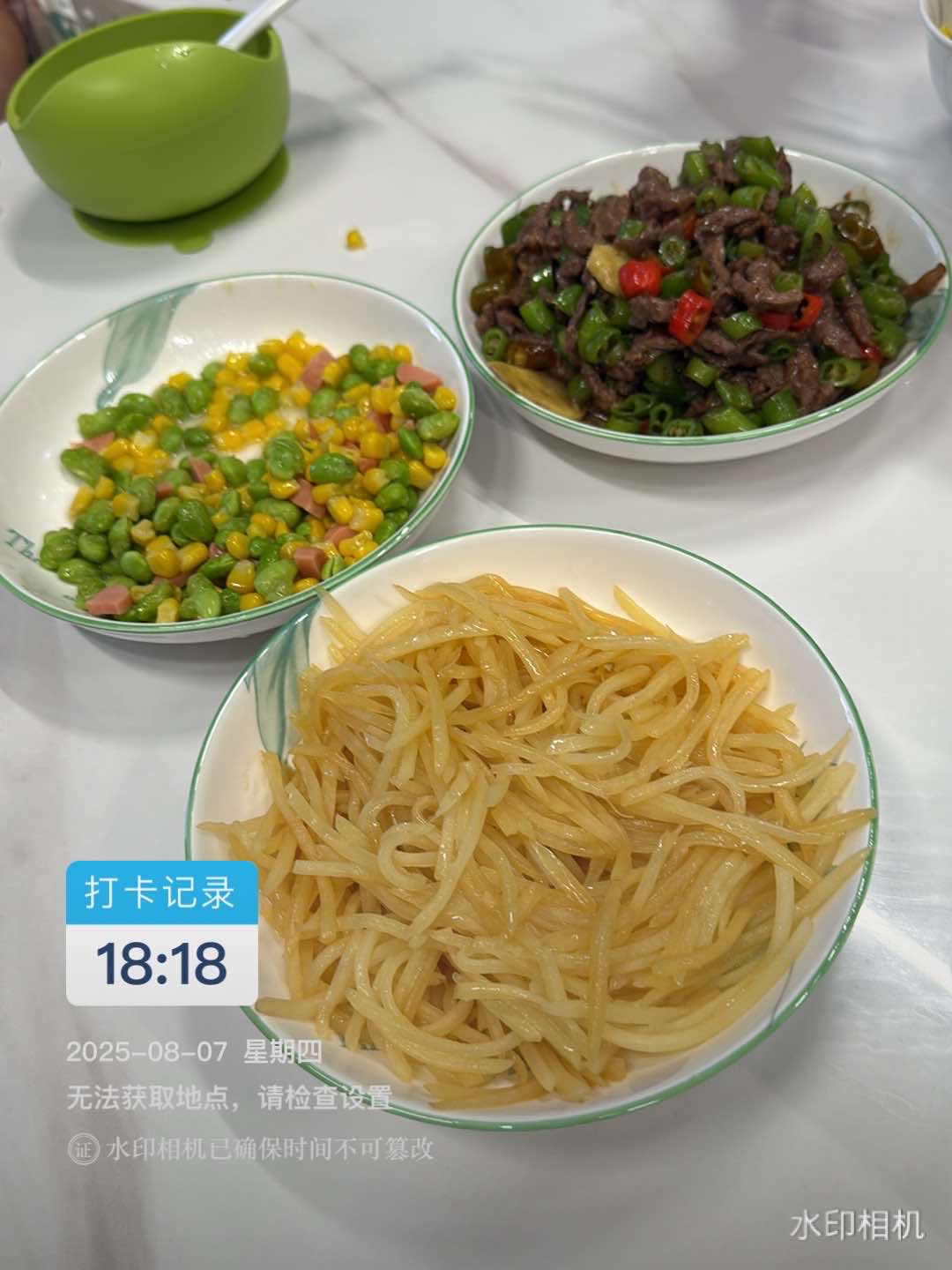今日晚餐,土豆丝,什锦才,炒牛肉(有点辣)最近我在减肥,我就吃两个蒸红薯,加油哦