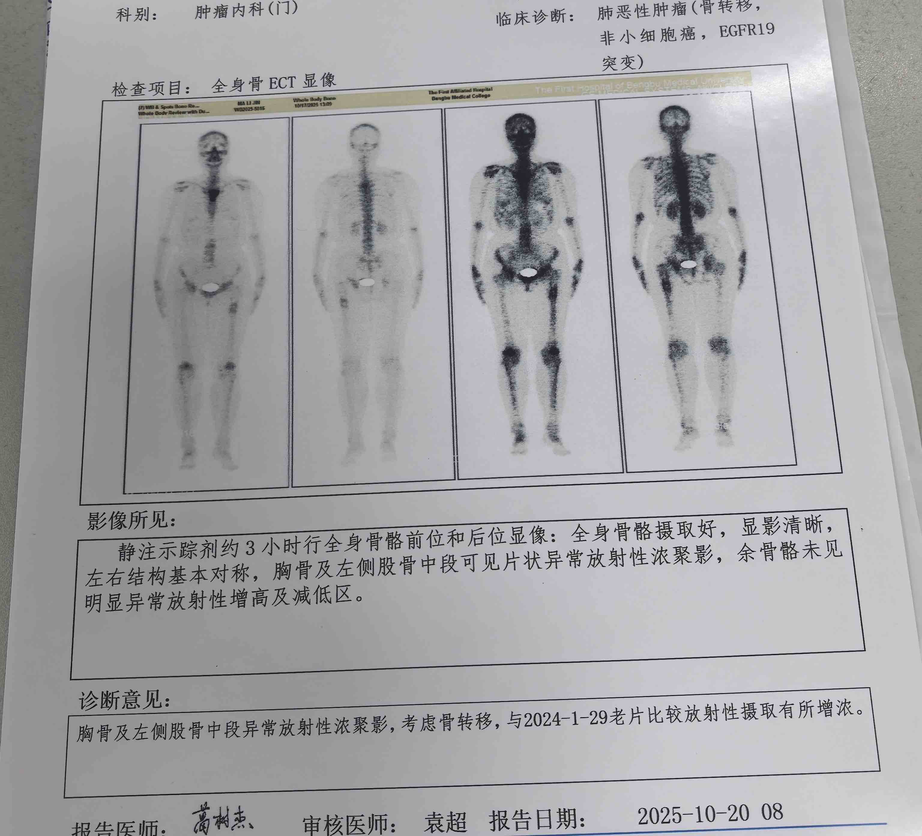 *问题所在:骨扫描(ECT)显示,原有的 胸骨、左侧股骨两处转移灶 “放射性摄取增浓”,提示活性增高。