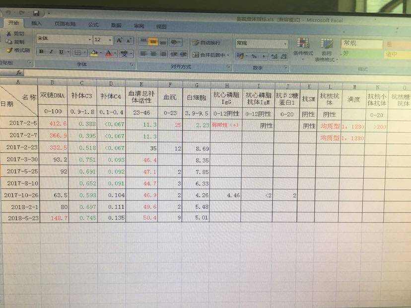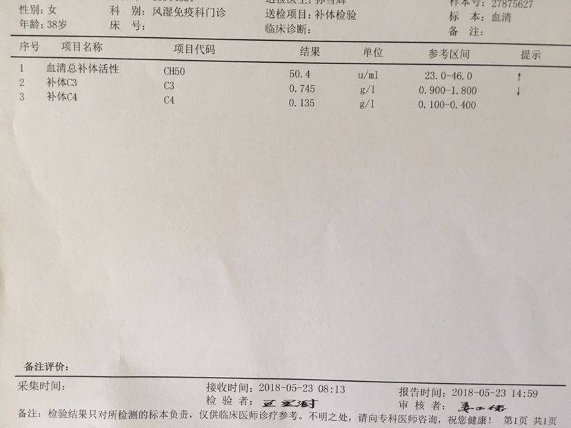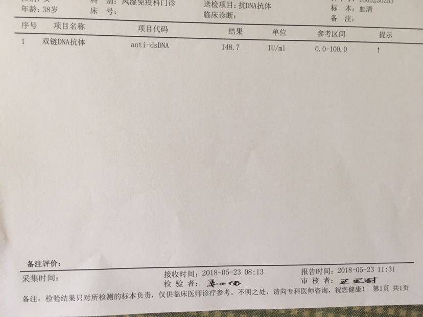 昨天复查,从去年3月份就正常的双链却升高了,补体C3略有升高。原来一直看的大夫挂不到号,这次的大夫让我一个月后复查,说怀疑双链查的不准,因为毕竟C3有好转。