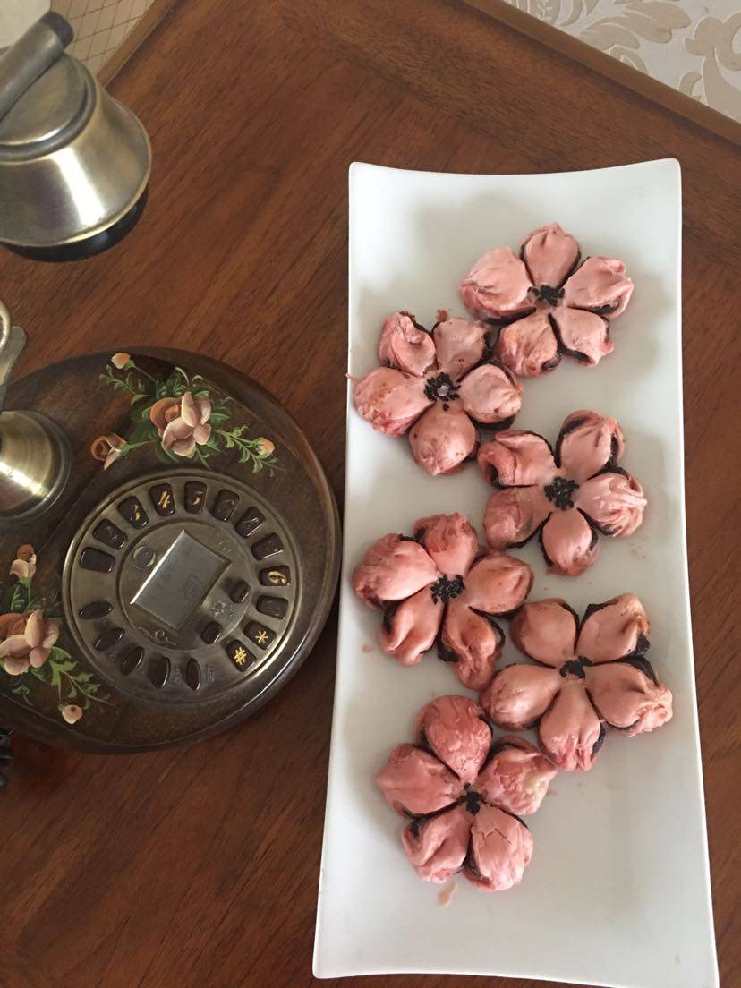 看见樱花酥的配方被成品的颜值打动,试验了一盘,把起酥的猪油换成了植物油效果差不多,油酥加少许红曲米着色,一个半小时后成品出炉,豆沙馅,口味非常好,吃好了再减肥。