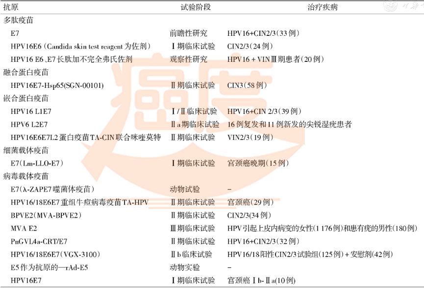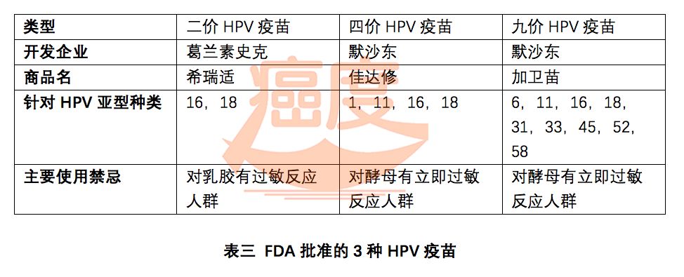 而我们通常所说的HPV疫苗一般是指HPV预防性疫苗,那么,HPV疫苗是否也可以用于癌症的治疗? 答案是肯定的! 近年来,HPV治疗性疫苗的开发也如火如荼,很多已经进入临床II、III期,不久或可面市。如果把HPV预防性疫苗比作抵抗癌症的“盾”,那么,HPV治疗性疫苗就是抗击癌症的“矛”。 下面,癌度带大家一起来看看HPV疫苗的“盾”与“矛”: 何为HPV ? HPV是英文Human Papilloma Virus的缩写,翻译成中文是人乳头瘤病毒。 现有的研究证明,HPV与宫颈癌、肛门癌、外阴癌、阴道癌、咽喉癌、阴茎癌、咽喉癌、尖锐湿疣等多种人类疾病有关,表一给出了HPV可导致的女性及男性疾病及其与HPV相关率。 在此,笔者想划一下重点: ①. 近乎全部(99.7%)的宫颈癌都是由高危型HPV持续感染引起的,画个图给大家体会一下: ②. HPV不但与宫颈癌有关,还与肛门癌等多种人类疾病有关; ③. HPV不但与女性疾病有关,还与阴茎癌等多种男性疾病有关。 何为HPV疫苗? 我们首先需要明确一点: HPV不止一种亚型,先分离鉴定的亚型就达130余种,而且,不同的亚型侵袭的组织部位有别,关联的疾病也不尽相同。我们通过表格来看一下这些关系:(表二) 那么,所谓HPV疫苗,广义上讲自然就是用来预防这些疾病的疫苗,但目前我们常提到的HPV疫苗(可称作狭义HPV疫苗)通常是指用来预防宫颈癌的疫苗。而HPV疫苗的“价”是指这些疫苗所能防御的HPV亚型,所以,HPV疫苗的“价”越多,能够预防的疾病亚型也就越多。 目前,已经上市的HPV疫苗有“二价”,“四价”,和“九价”三种,我们通过表三一起了解下这些疫苗的具体信息: 以上三种疫苗目前均在我国上市,其中九价HPV疫苗是今年上半年刚在我国获批上市。 值得一提的是,相对于二、四价HPV疫苗,九价HPV疫苗包含了亚洲人最容易感染的HPV52、28两种亚型,因此在我国上市至关重要。而且,九价HPV疫苗覆盖足以预防90%以上的宫颈癌。 HPV疫苗适宜接种人群 1)先谈男女: 就FDA批准的情况来看,二价HPV疫苗仅适用于女性接种,而四、九价HPV疫苗女性、男性均可接种。 2)再谈老少: 就共性来看,这三种HPV疫苗推荐接种年龄都是9-26岁,且一般认为最佳接种年龄为9-14岁。 在本次新批准之后,九价HPV疫苗可适用于9-45岁的女性及男性,但27-45岁的新适应范围目前尚未在国内获批。 根据我国2017版《子宫颈癌综合防控指南》建议,我国宫颈癌疫苗接种的重点人群是13~15岁女孩。 接种HPV疫苗有哪些注意事项? 接种者需要将过敏史、月经史、怀孕等情况告知医生。 一般地,对乳胶有过敏反应人群禁用二价HPV疫苗;对酵母有立即过敏反应人群禁用四、九价HPV疫苗。 其次,患有中重度疾病人群需要延缓注射HPV疫苗;以及在使用某些免疫制剂、感冒等身体处于不稳定地状况下需要延缓注射HPV疫苗。 虽然目前HPV疫苗对孕妇、胎儿显示没有危害,但是建议孕妇或准备怀孕的女性,不建议注射HPV疫苗;如果注射第一针后发现怀孕,也要暂停注射疫苗,待产后继续补充完成接种;如果接种疫苗完成后想要怀孕,建议等待3-6个月在做考虑。 最后需要指出地是,虽然接种九价HPV疫苗可以预防大部分宫颈癌,但仍然不能预防所有致癌高危型HPV感染,因此,即使接种了宫颈癌疫苗,仍然需要定期进行宫颈癌筛查。 六类HPV治疗性疫苗及其特征 前面所说的HPV疫苗是指 预防性疫苗,并不能治疗已经发生的HPV相关疾病。 近年来,随着基因组学和蛋白组学对肿瘤抗原的解析,针对各种抗原设计的治疗性疫苗开始了动物和人体临床试验,HPV治疗性疫苗也应运而生。 就HPV的致癌机制而言,目前HPV治疗性疫苗针对的靶抗原基因主要是E6、E7、E2、E5。其中,E6、E7蛋白被认为是最重要的致瘤蛋白,在体内可持续表达于HPV阳性的细胞;E5蛋白主要通过增强表皮生长因子受体的活性来实现致癌能力。 而就HPV治疗性疫苗组成成分而言,可将其分成6大类:肽类疫苗、蛋白疫苗、载体疫苗、DNA疫苗、树突细胞疫苗以及过继细胞疫苗。至于这几种治疗性疫苗的优缺点,请看表四总结。 表四:六类HPV治疗性疫苗及其特征 目前HPV治疗性疫苗的临床前及临床研究现状 表五统计了目前研发进展较快的临床前及临床研究阶段的HPV治疗性疫苗,其中,进展最快的MVA E2治疗性疫苗已经进入临床III期研究,该疫苗能有效刺激机体产生针对HPV的免疫反应并使高级别病变减退。 表五 HPV治疗性疫苗的临床前及临床研究现状 针对1176例HPV引起上皮内病变的女性和180例仅患有疣的男性中开展的Ⅲ期临床试验显示,MVA E2治疗性疫苗能使89.3%女性的病变消退,100%男性的病变消退。 表五中所示HPV治疗性疫苗临床试验针对宫颈癌的有:E7(Lm-LLO-E7, ADXSⅡ-001,axalimogene filolisbac)、TA-HPV以及HPV16E7等。其中,E7(Lm-LLO-E7, ADXSⅡ-001,axalimogene filolisbac)是由Advaxis公司开发,是一种基于HPV16 E7抗原的灭活减毒李斯特菌载体疫苗,其I期临床显示,所有患者均可耐受此疫苗,且15例传统疗法失败的晚期患者中有8例病情得到控制,治疗的12个月总生存率为38.5%。 值得一提的是,2018年7月,FDA批准了一项I/II期临床研究,该研究联合了阿斯利康的PD-L1单抗药物——度伐鲁单抗(durvalumab,I药)与E7(Lm-LLO-E7, ADXSⅡ-001,axalimogene filolisbac)治疗晚期、复发难治性HPV相关宫颈癌和HPV相关的头颈癌。 如下图所示,该临床试验将比较I药、ADXSⅡ-001二者单用及二者联合用于治疗的疗效。笔者认为,二者强强联合,必会擦出神奇的火花! 图:度伐鲁单抗(d