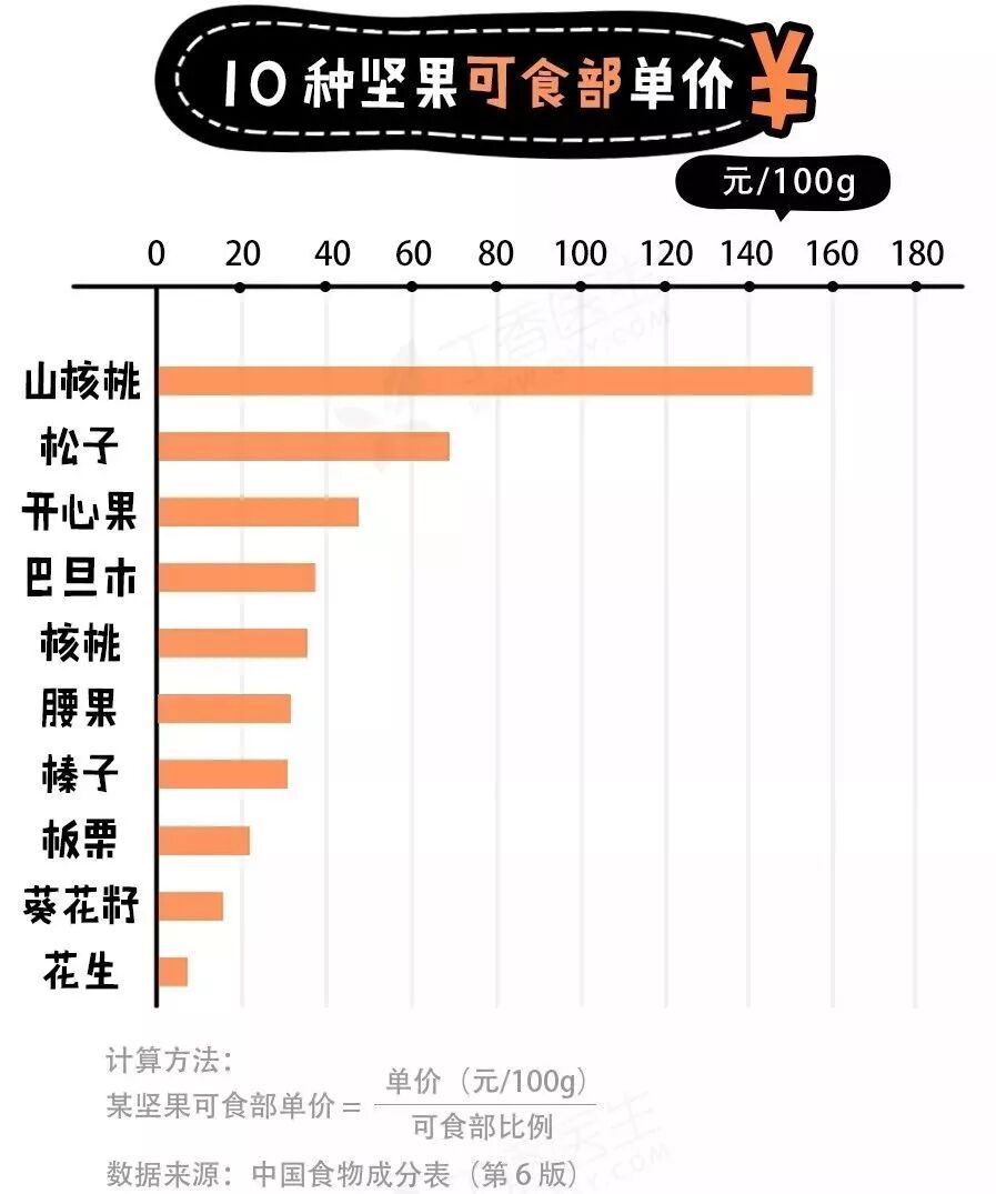 能吃的地方太少,再加上单价本来就不低,最终,山核桃遥遥领先于第二名的松子,轻松获得了可食部单价的榜单冠军。