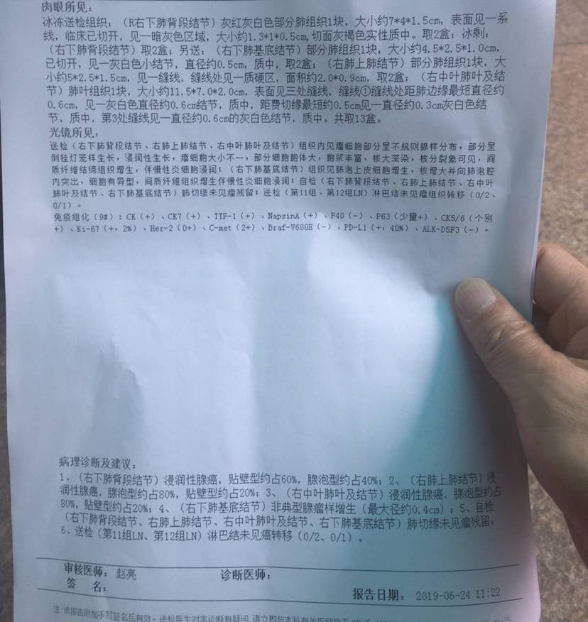 然后,一切都变了。2019年5月6日,爸爸单位体检,查出左肺上叶占位。后来经过一系列检查,头部核磁,增强ct,petct各种检查都显示只有这一个病灶,在6月6号左肺上叶切除手术,期间我和妈妈还有我老公精心轮流照顾,很快出院了。没想到术后大病理显示,一共清扫了12枚淋巴结,其中第六组的1枚淋巴结显示转移,一下子把我们从手术前判断的1期,直接变成3a期了,术后又做了基因检测,EGFR19突变。
