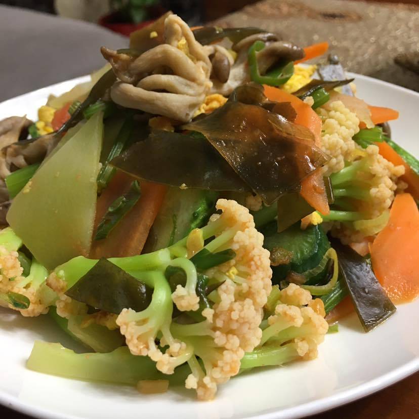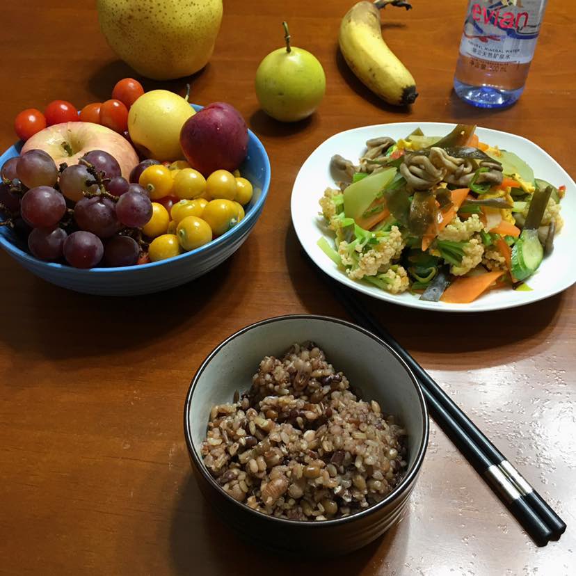 今天十五早餐全素:海带胡萝卜黄瓜片炒鸡腿菇菜花/青稞绿豆花豆糙米饭/水果