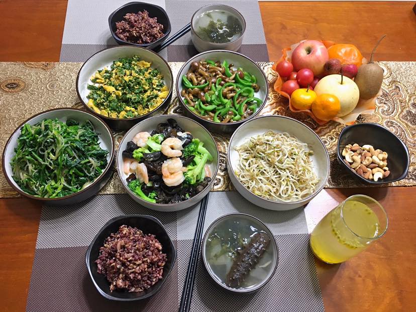 早晨:滑子菇炒青椒/虾仁西兰花炒木耳/菠菜拌薯粉/芹菜叶炒土鸡蛋/虾皮冬瓜紫菜汤/醋炒绿豆芽/15种米杂粮饭/百香果水/坚果/水果😄一天所需营养足够啦✌️吃完打包带走😄工作午餐