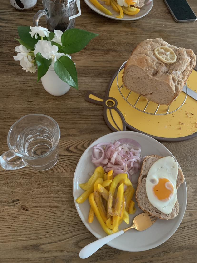 昨晚烤的柠檬土司,柠檬汁加大了,略微酸,煎鸡蛋,热油炒点洋葱丝和黄椒、冲咖啡,十五分钟就能吃上早饭~ ​