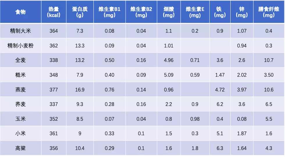 全谷物保留了天然谷物的全部天然营养成分,如谷皮(糠)中含有膳食纤维、B族维生素、矿物质和植物化学物质;糊粉层有较多的蛋白质、脂肪、丰富的B族维生素及矿物质;胚芽是谷粒发芽的地方,含有脂肪、多不饱和脂肪酸、维生素E、B族维生素和矿物质等;