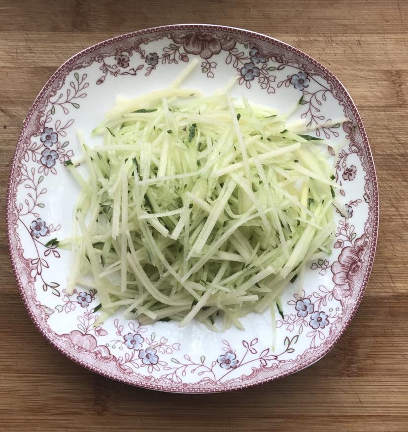 盘子里是黄瓜丝和🍐梨丝(刀工还是可以的哦🤣)加了一点点糖和盐(没办法精准计量,靠经验吧😝)它们能碰撞出什么样的舌尖美味呢?🤔是另一种水果的味道😝😋😂猜猜看,是什么?猜对了,小鹏告诉你流食的营养搭配~哈哈😂😘