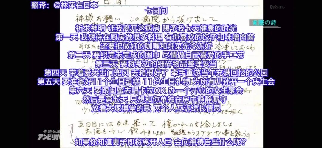 最后/我愿意被你牵着手/紧紧地/紧紧地等到生命最后一秒。英司承诺容子,只要挺过去这次劫难,就和她一起实现这7个愿望,一起做11个蛋糕,一起听大冢博堂的歌曲,慢慢地聊两个人的事。英司牵着的手慢慢慢慢地凉下去,医生宣判死亡后他又等了12个小时,容子也没有醒过来。容子死后,英司为她挑选了全日本最好的墓地,还在旁边留出了自己的位置,告诉孩子们:“你妈怕孤单,请一定把我葬在她的旁边。”妻子曾经以旧姓“三木容子”的名字,小学生报纸上出了作文题,并写了解说。操持完葬礼,孩子们提出要把英司接去东京和孙子们一起生活,但是英司拒绝了。“大家都劝我朝前看,不要再去想她了,但是我一直走不出没有她的日子。”失去了容子,英司也像是失去了半个魂魄。但即便如此,他还是坚持和一只叫做“小春”的狗,一起住在和容子生前的家里。每天早上醒来,他会自顾自地和“小春”说话,彷佛小春就是容子。每当思念容子到极致,他就会整理容子的遗物,有一天在看着容子的东西发呆的时候突然发现了一个日记本。