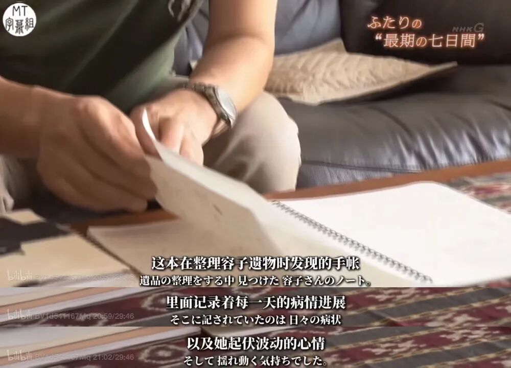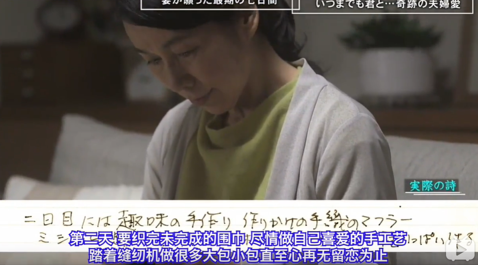 每天容子下班后回到家,都能看到宫本英司已经做好了饭菜在等她,她对英司说这样的晚年生活真的是太幸福了,是她一生中最幸福的时光。但是好景不长,容子67岁这年,先是被诊断为感染性肠炎,后来被发现是小肠癌时,已经到了晚期了。医生断言,容子最多只剩下两年的生命。宫本英司劝了妻子好久,容子才同意,这天,她喝下了口服药,趁着丈夫不在的时候,在日记本上写下了一段文字:“没有忍不住的副作用。如果能通过治疗,多活一天算一点。希望和老伴过的时间能更开心一些。就是想紧紧抓住生命的尾巴。”后来的一年多,肿瘤的相关病理数据很稳定,容子说:“要给宣告自己‘两年徒刑’的那位医生一点颜色看看,看看容子是不是那种容易被打败的人。”看着妻子饱满的精神状态,宫本英司觉得医生的话不一定正确,或许容子,是千千万万个癌症患者中的例外呢。接下来的时光,除了化疗,两人大部分时间都用来玩电脑游戏,每次得分出来后两人都会比较一下,容子还会把得分记下来,说下次一定会赢过他。谁都没有想到,容子的病情在7月突然恶化,被推进了医院进行手术,做手术的当天,她指使丈夫回家做鸡肉饭,然后偷偷拿出包着白色书皮的笔记本,在丈夫和孩子的名字后面,认真地写了一句”谢谢“。并写道:“我身上的病,我自己承担,你们一定要健康地好好活着”。做完手术后,容子瘦了10公斤,宫本英司担心她的身体为她请了家庭理疗师,还购买了轮椅,想着这样明年春天就能推着她去看樱花了,但是容子却说自己没事,还沉迷上了做手工,木雕和陶艺,并开了一个手工展览。乐观且充满活力的容子,再一次骗了英司。就在英司再度以为妻子病情要好了的时候,容子再度被推进了急救室。医生宣布要进行手术,做手术之前,容子躺在床上给英司念了这首《七日间》:第一日我要待在厨房/做各式各样你喜欢的料理/饺子和味噌/多做一些放进冷冻室